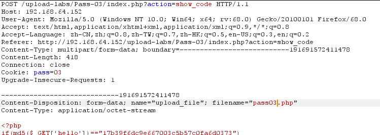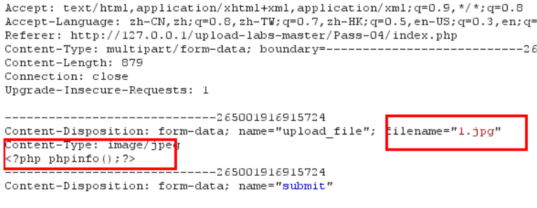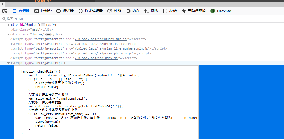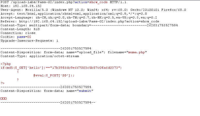 Pass-02 验证Content-type 本题中使用传统的抓包,单纯修改后缀名是不行的 查看源码观察一下: