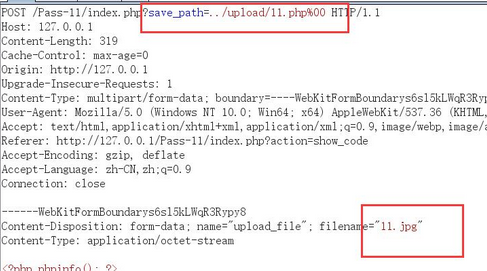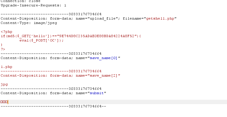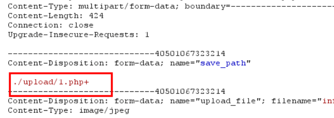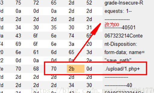 save_path 从 GET 变成了 POST, 此时不能再使用 %00 截断, 原因是 %00 截断在 GET 中被 url 解码之后是空字符, 但是在 POST 中 %00 不会被 url 解码, 所以只能通过 burpsuite 修改 hex 值为 00 进行截断. 这里把 2b(‘+’的 hex) 修改成 00 或者把 20(‘空格’的hex)修改为00