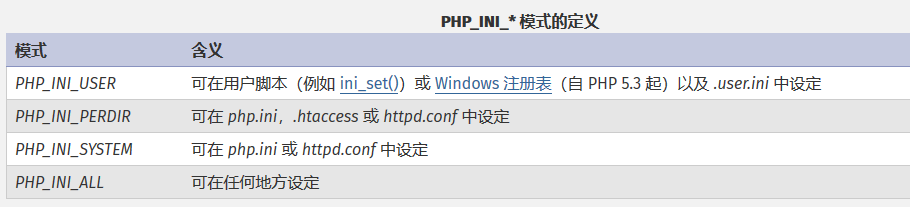 实际上,除了PHP_INI_SYSTEM以外的模式(包括PHP_INI_ALL)都是可以通过.user.ini来设置的。