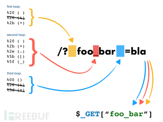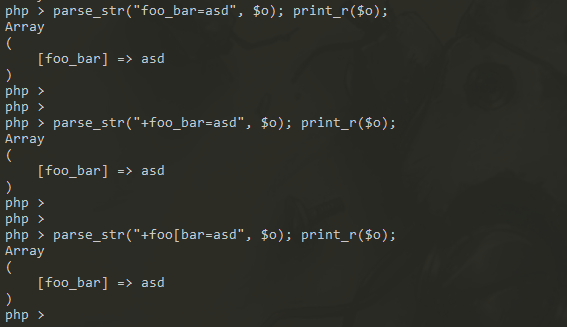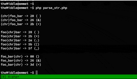 parse_str函数通常被自动应用于get、post请求和cookie中。如果你的Web服务器接受带有特殊字符的参数名,那么也会发生类似的情况。如上代码所示,我进行了多次循环,枚举了参数名三个位置的0到255之间的所有字符,看看解析函数到底是如何处理这些特殊字符的。结果如下: