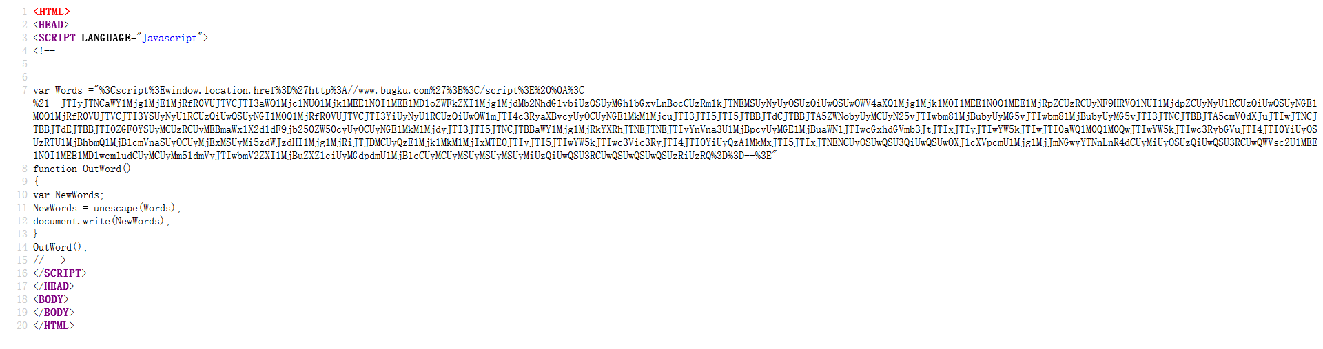 发现了个1p.html,打开后直接跳转到bugku主页 想到可能是重定向跳转过去的 于是利用 view-source:http://123.206.87.240:8006/test/1p.html 查看源码